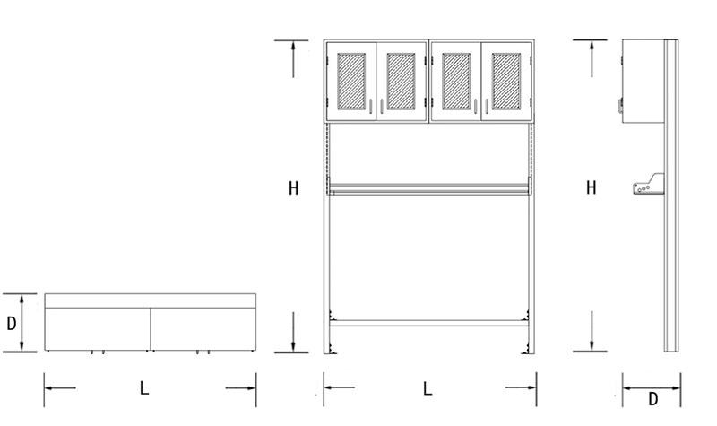 el bastidor se encuentra hecho de acero de 1.5mm de espesor, el cuerpo del gabinete suspendido se encuentra hecho de acero de alta calidad de 1.0mm de espesor, las manijas del bastidor tipo C se encuentran hechas de acero inoxidable SS304, los estantes se encuentran hechos de vidrio templado - Acabado: blanco