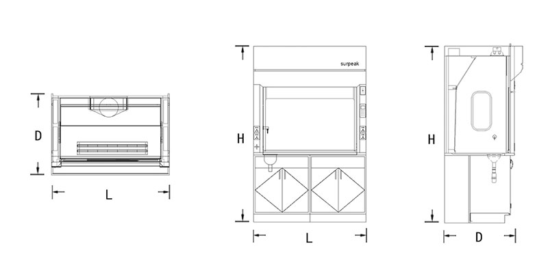 Se utiliza paneles de acero de 1.2mm, la campana está hecha de paneles de acero 1.0mm, posee revestimiento de polvo epoxi, ducto de recolección de aire de material de PP. - El diámetro del ducto es alrededor de φ200mm, y la altura del tubo de conexión es de 50mm. El panel de control LCD controla la velocidad del viento, cambia la potencia y ofrece botones de luces.